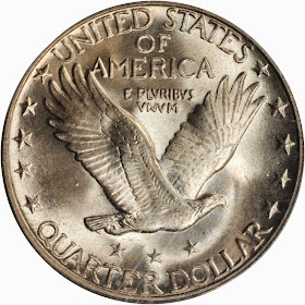 Thus, the Standing Liberty quarter was born. As was the case with the other new coinage, a competition was held to select the design. The artist chosen was a prominent sculptor of the day, Hermon Atkins MacNeil, who was known for his works dealing with Indians and American history, particularly on public buildings and monuments. MacNeil's obverse design features a frontal view of Liberty, a portrayal reminiscent of ancient Greek sculpture, with an olive branch of peace in her right hand. Her left arm is raised, holding a shield in a posture of protection. A mixed message certainly, but one that told our European neighbors we were ready for anything, peace or war. The inscription LIBERTY is at the top of the obverse, with the motto IN GOD WE TRUST flanking the figure of Liberty and the date below. The reverse, as mandated by law, depicts an American eagle, here shown in full flight, with the legend UNITED STATES OF AMERICA and motto E PLURIBUS UNUM, above, and the denomination Quarter Dollar below. The final product seems to reflect the influence of Augustus Saint-Gaudens, who was the most famous sculptor of the time and a mentor some years earlier for Mr. MacNeil.